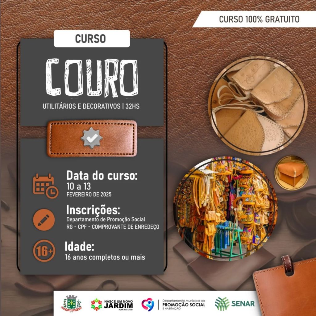 Com o objetivo de capacitar e desenvolver a produção criativa com artesanatos, o Departamento de Promoção Social e Habitação em parceria com o Sindicato Rural de Espirito Santo do Pinhal e SENAR anunciam o curso gratuito: COURO - Utilitários e Decorativos.