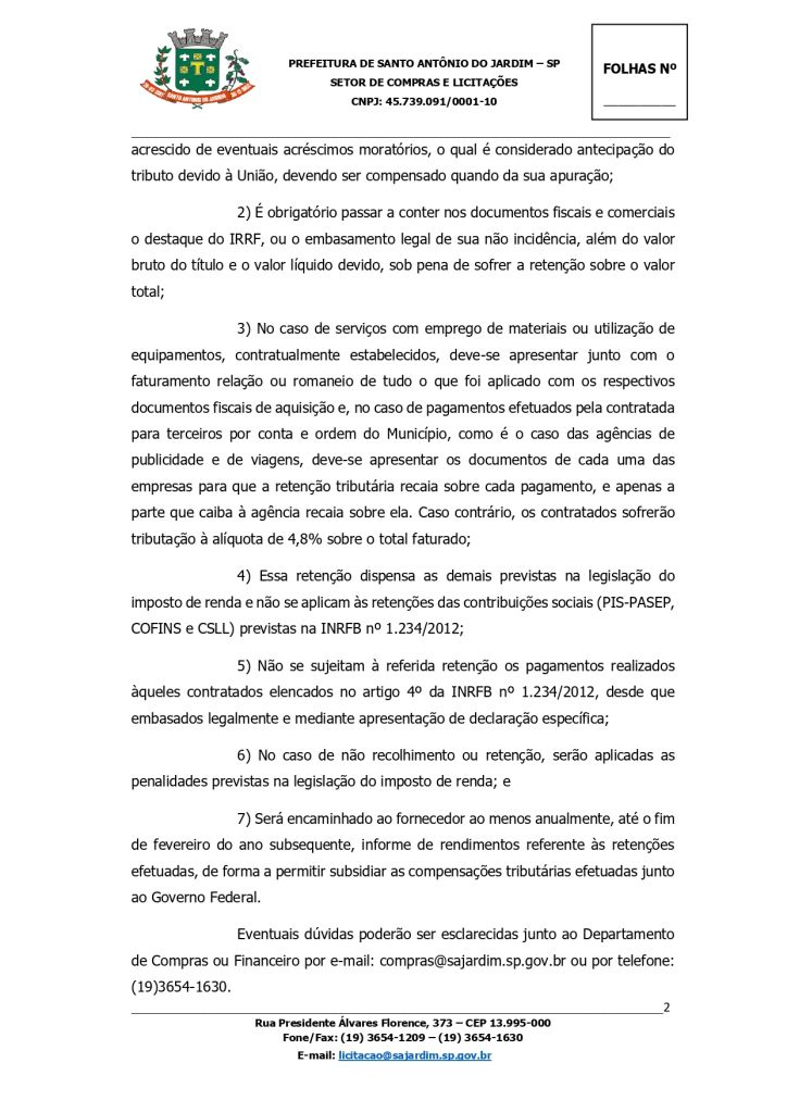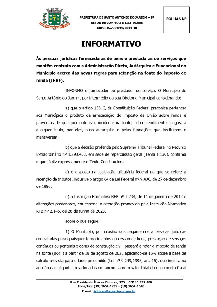 Notificação destinada às pessoas jurídicas fornecedoras de bens e prestadoras de serviços que mantêm contrato com a Administração Direta, Autárquica e Fundacional do Município acerca das novas regras para retenção na fonte do imposto de renda (IRRF)